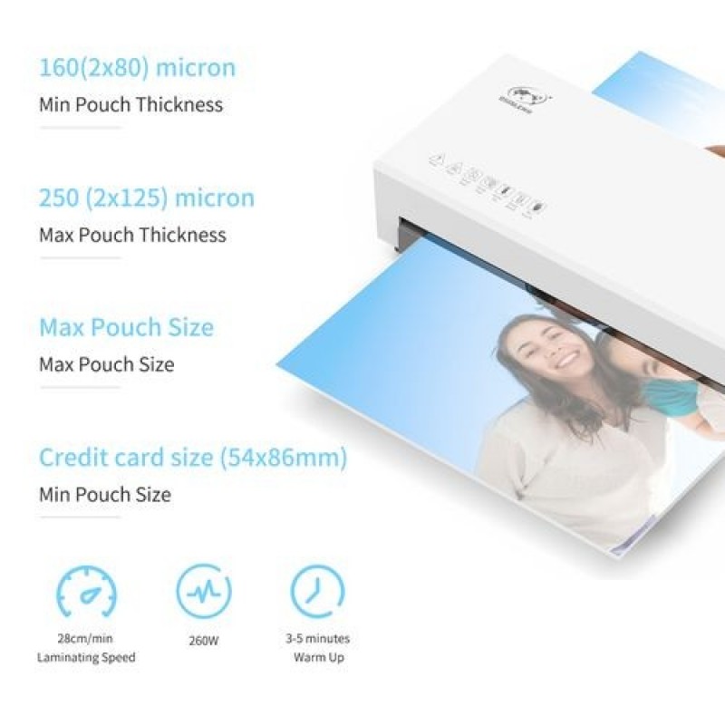 Excellent Capacity - SL266 is a personal laminator designed for hot and cold lamination. The minimum laminating thickness is 160 (2x80) microns and the maximum thickness is 250 (2x125) microns.