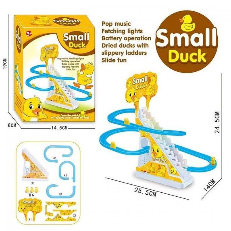 3. The duck toy set is equipped with flashing LED lights, the toy has a fun soundtrack and upbeat music (with an on/off button), when you start, the duck will climb the stair with the music, and then slide down the slide.